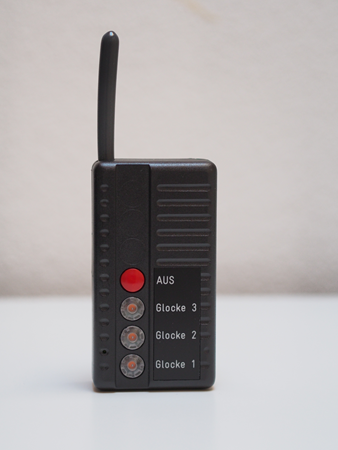 Die Funksteuerung besteht aus einem Handsender (siehe Abbildung) und dem Empfänger. Mit den Tasten „Glocke 1“ bis maximal „Glocke 7“ können alle Glocken einzeln ein- und ausgeschaltet werden, um ein harmonisches An- bzw. Ausläuten zu ermöglichen. Durch die beleuchteten Tasten erhalten Sie eine direkte Rückmeldung, ob die Glocken auch tatsächlich eingeschaltet wurden. Alternativ können alle Glocken gemeinsam mit der „Aus“-Taste abgeschaltet werden. Eine elektronische Tastenverriegelung verhindert das versehentliche Einschalten der Glocken.