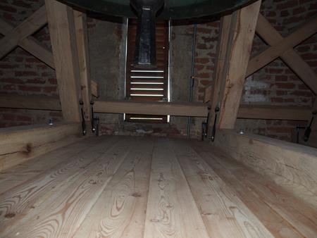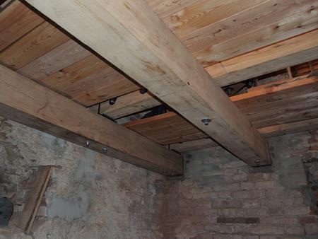 – Einbau neuer Unterzugsbalken aus Eiche, sowie Lärchenholzbohlen für den Glockenstubenboden